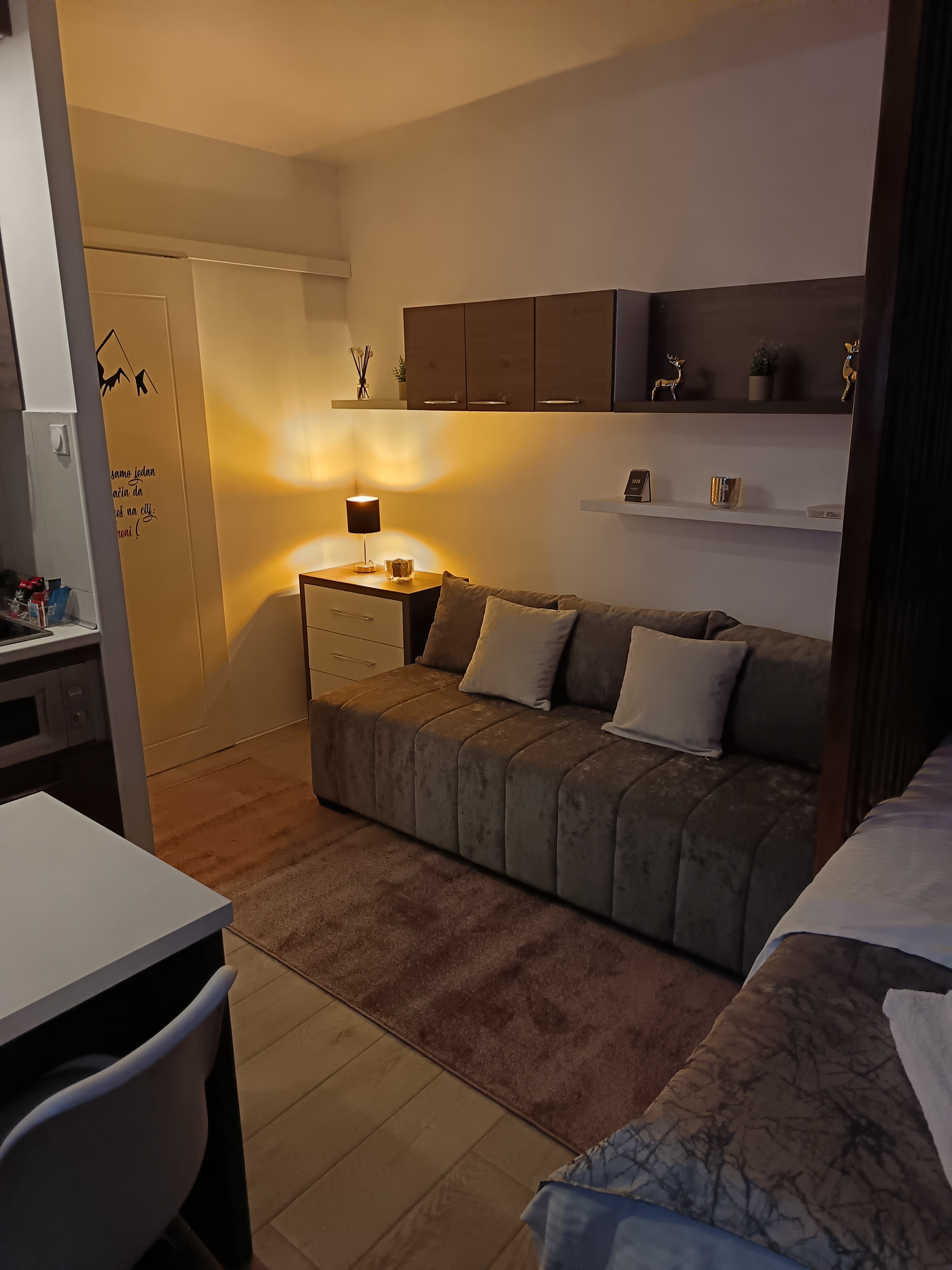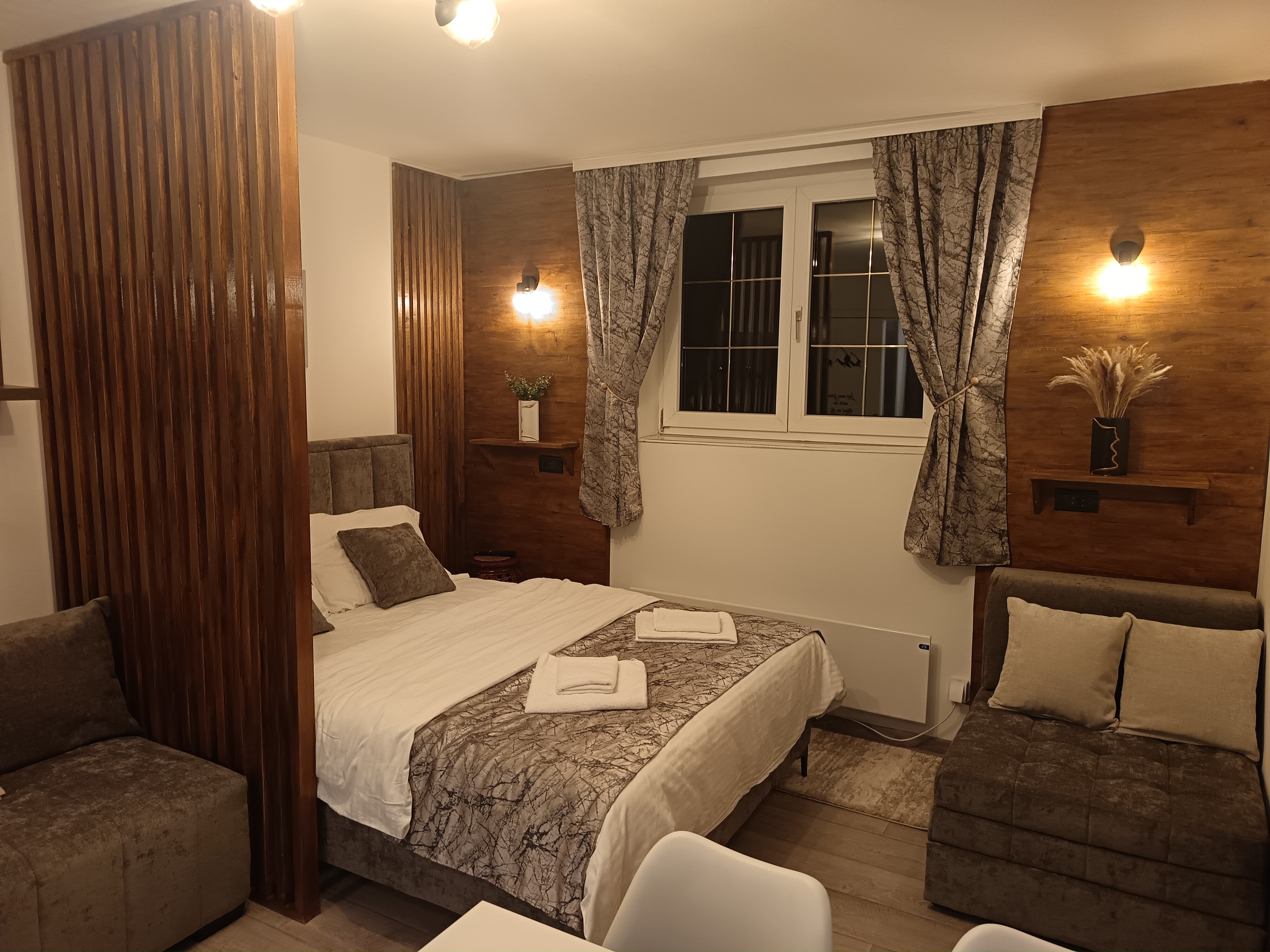 Moderno opremljen apartman, smešten na samo 100 m od početne stanice gondole Brzeće-Mali Karaman i ski staza Bela Reka 1 i 2, od Brzeca do vrha Kopaonika gondolom stiže se za 12 minuta, idealan za odmor porodice ili prijatelja. Enterijer kombinuje drvene detalje sa savremenim dizajnom, stvarajući toplu i prijatnu atmosferu za udoban boravak. Apartman sadrži jedan bracni krevet, jedan obican krevet i fotelju na razvlačenje, pružajući smeštaj za 2 do 5 osoba.
